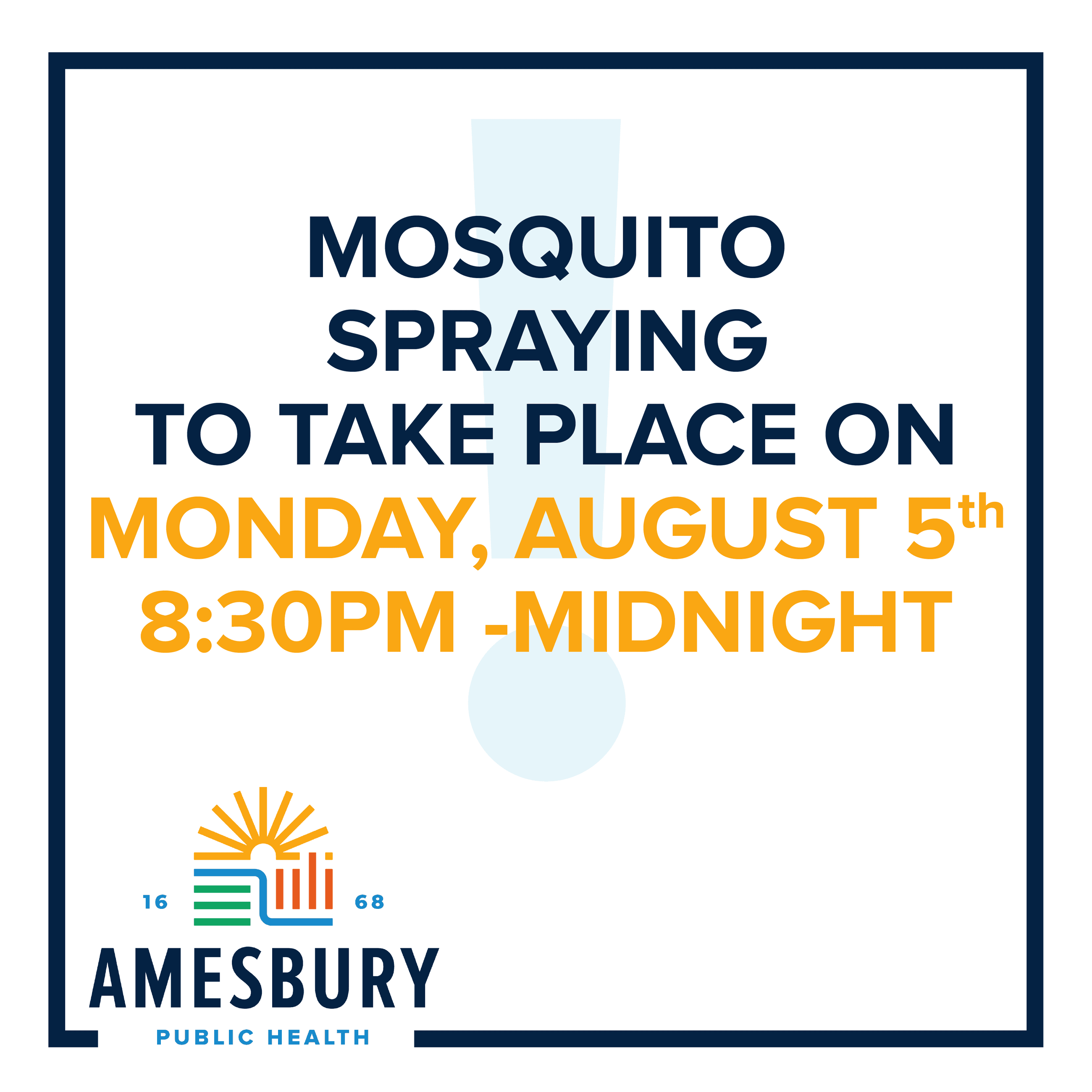 Spraying: The Massachusetts Public Health Laboratory confirmed the presence of mosquitoes testing positive for Eastern Equine Encephalitis (EEE) at one of their trapping sites collected on 7/30/2024 in Amesbury. In response, spraying will occur on Monday, August 5, 2024, beginning approximately 30 minutes after sunset. A truck will pass through the neighborhood dispensing an Ultra-low Volume (ULV) pesticide. Catch basins and standing areas of water will also be treated. There is a rain date of Tuesday, August 6, 2024.